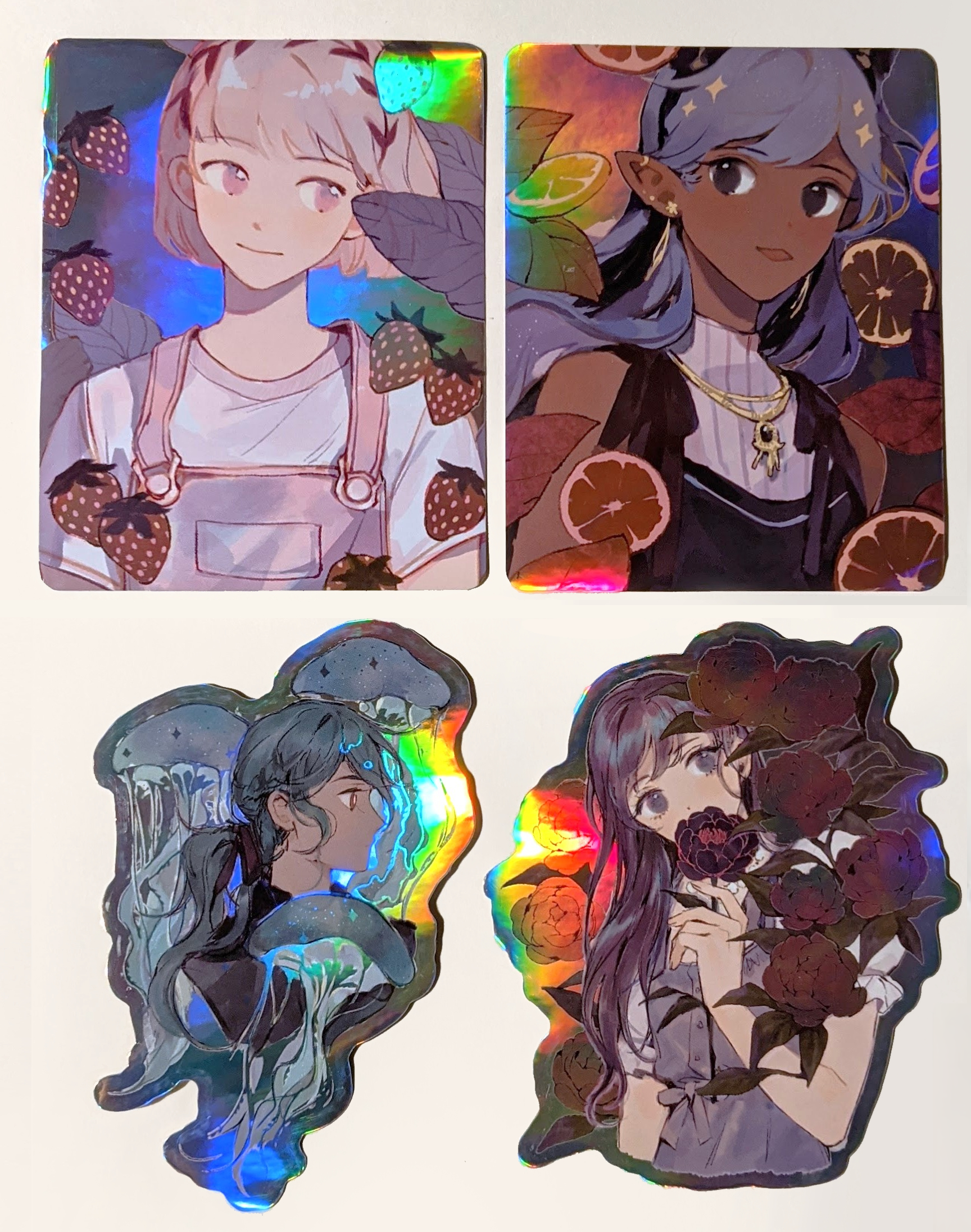 A pack of 4 iridescent stickers featuring my original characters.