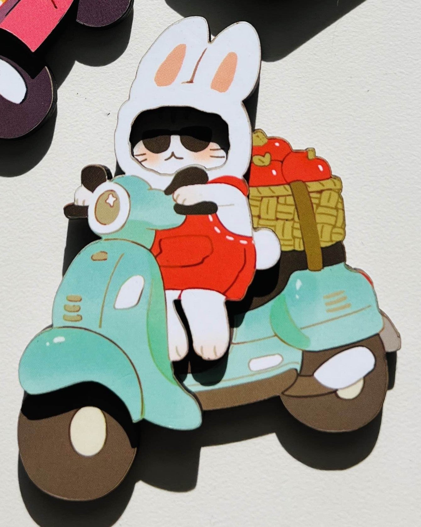 This magnet is of Sesame delivering apples on a scooter. Sesame is my cat daughter who looks permanently miserable but is actually very happy, adopted near a dumpster on my 12th birthday. Her timid nature and fluffy body makes me think she is a bunny disguised as a cat.